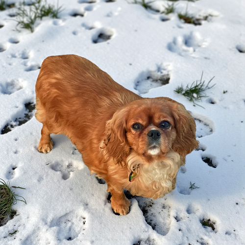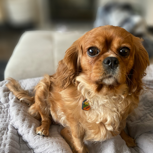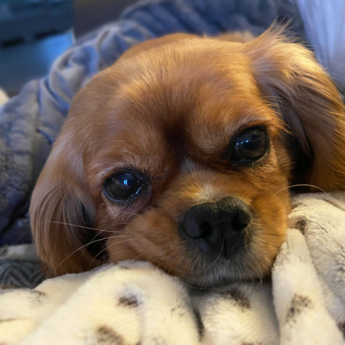 Aubrey came to rescue from a commercial breeding facility, so she’s still learning some of the basics of life in a home. She is currently working on potty training and is doing wonderfully! Given the challenging Northeast winter weather, she is pad trained but will reliably go to the bathroom when taken outside or out for a walk. With a little patience and consistency, she’ll continue to blossom. She’s not super keen on the crate. As a typical Cavalier, she would most prefer to lounge on the couch or in bed.