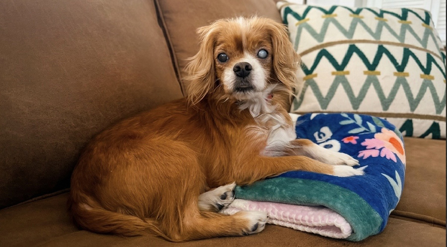 Biscuit is fully blind in his left eye and has limited vision in his right. He also has dry eyes that require daily drops. Despite his vision limitations, Biscuit doesn’t let it slow him down one bit, as he navigates his environment confidently and happily. Other than that, Biscuit is in good health, up to date on all vaccinations, and is microchipped. He arrived with dry skin that has significantly improved and continues to benefit from a special shampoo, though he may still be a bit flaky at times.