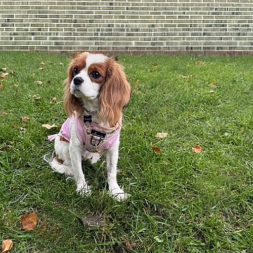 In her foster home, Ginny has shown remarkable growth. While she finds safety in her crate, she also feels confident spending time in the living room with her foster mom. She is extremely food motivated and shows her courage daily by accepting treats from coworkers when accompanying her foster mom to work. Ginny has developed a special bond with her Cavalier foster brother and foster mom, often following them around the house as their little shadow. She thrives in their company and would do well with another calm, confident dog in her new home to show her the ropes.