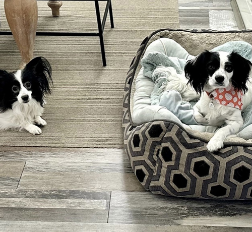 A model houseguest, Lulu is reliably housetrained and adapted quickly to her foster home. She’s a calm and loving companion, happy to nap or play quietly with her toys. She gets along beautifully with her Cavalier and Papillon foster sisters, and is content to relax quietly with her toys nearby while her foster Mom works.