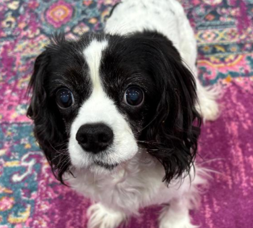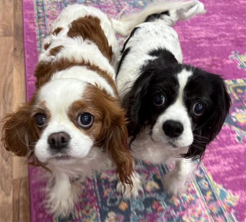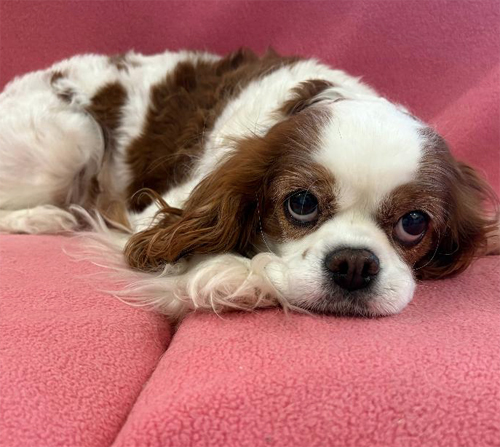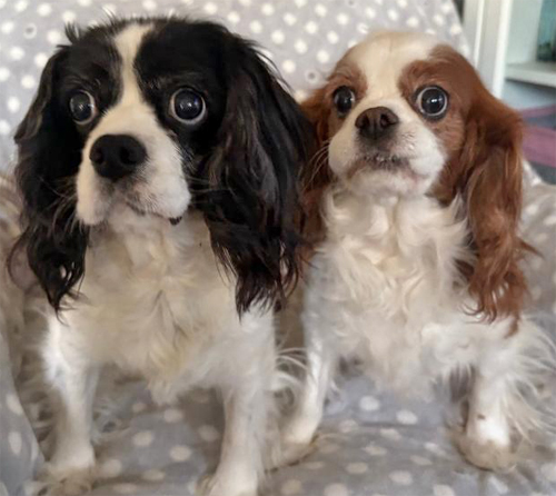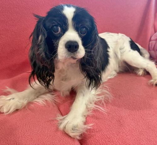 Phoebe and Pearl are a bonded pair. Phoebe is an 11-year-old Blenheim, and Pearl is a 10-year-old and black and white. Both girls were in rough shape when they came into rescue, but they are now thriving in their foster home. They have wonderful, sweet personalities. They are a relaxed and affectionate pair who just want a comfortable and loving home for the rest of their days.