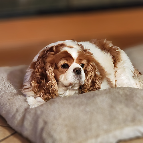 Phoebe is a classic Velcro Cavalier through and through. She doesn’t need to be in your lap, but she does want to be right by your side. Whether you’re working at your desk, cooking dinner, or reading on the couch, she’ll be nearby. She simply wants to be part of whatever you’re doing.