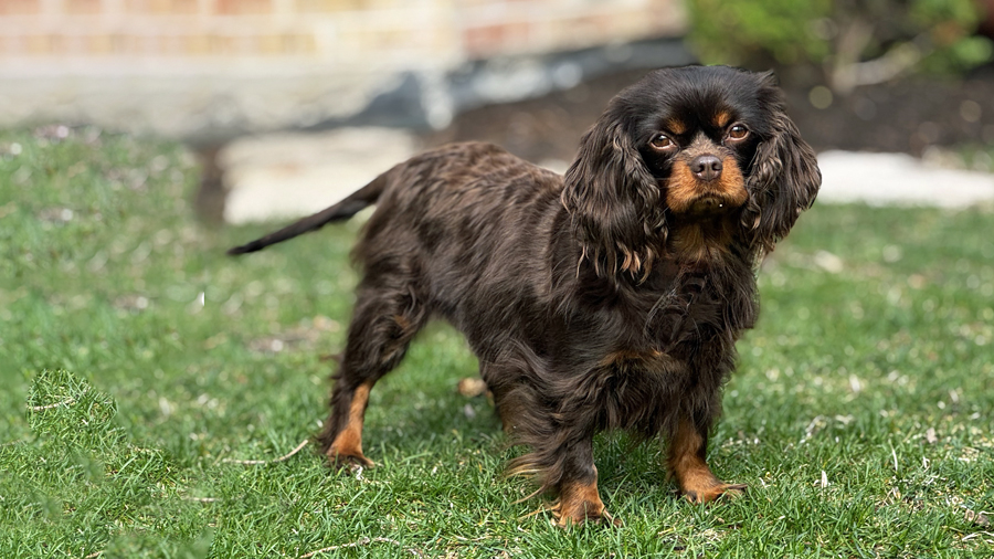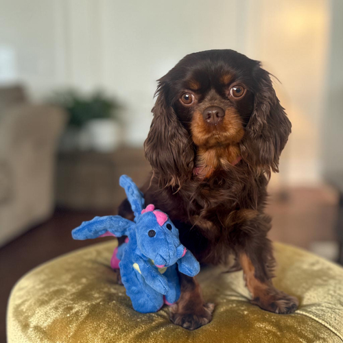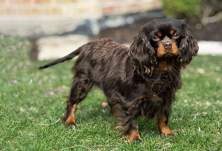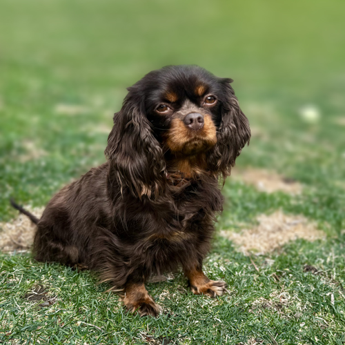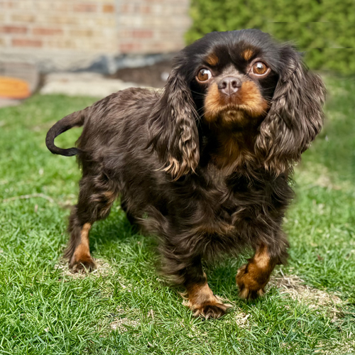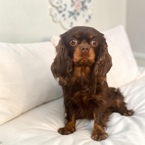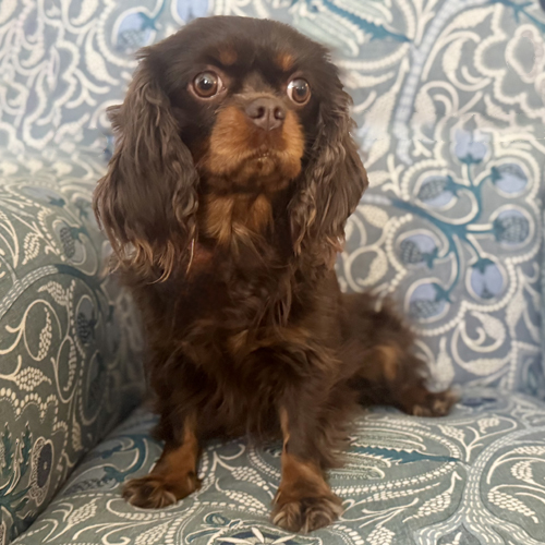 Hi! My name is Rosie and I am a tiny 13-pound bundle of chocolate love! I was given to Cavalier Rescue USA by my breeder who wanted the perfect forever home to be found for me. I am a 3-year-old (my birthday is 11-7-2022) Chocolate and Tan Cavalier and I have the biggest heart for everyone I meet. All I want in life is to share my love with my new people. I love nothing more than cuddling on the couch next to my foster mom or lounging on my furry dog bed at her feet while she works. I can’t be close enough! I have a calm personality and a gentle temperament and do not bark except when my people return home; I have to tell them just how much I love them.