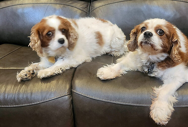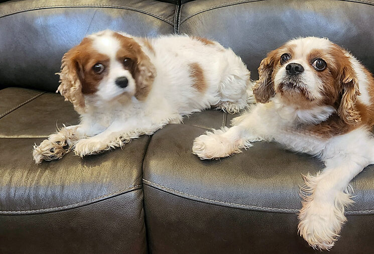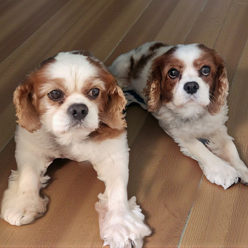 Meet Snickers and Twix, a bonded senior pair of Blenheim Cavaliers. Snickers is a ten year old female weighing 20 pounds. Twix is an eight year old male who weighs 23 pounds. They are a delightful duo.