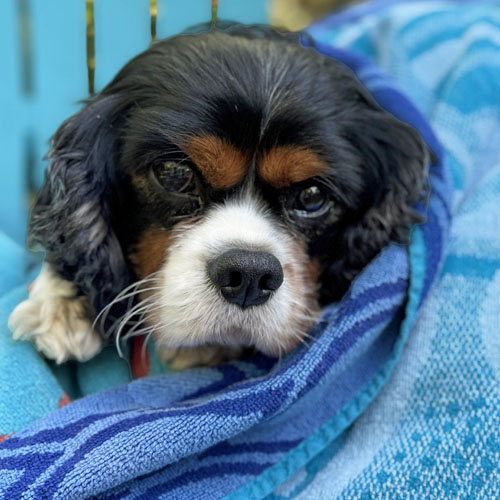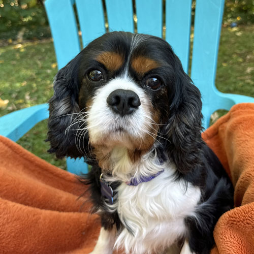 Frankie spends the day sitting near his foster mom (who works from home) and hanging out with the other Cavaliers in his foster home. He enjoys playing fetch and exploring in the fenced yard at his foster home and going on walks in the neighborhood. But Frankie’s absolute most favorite thing in the world to do is snuggle. If he could somehow figure out a way to crawl into his people’s skin through their belly button he would. He wants to be THAT close to his people.