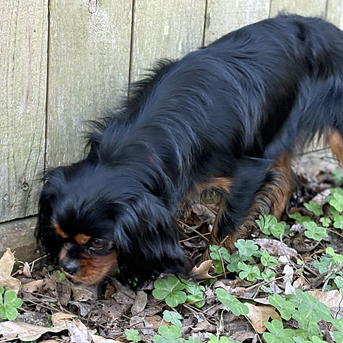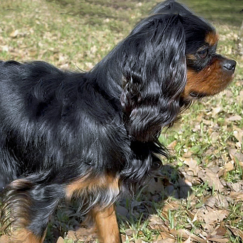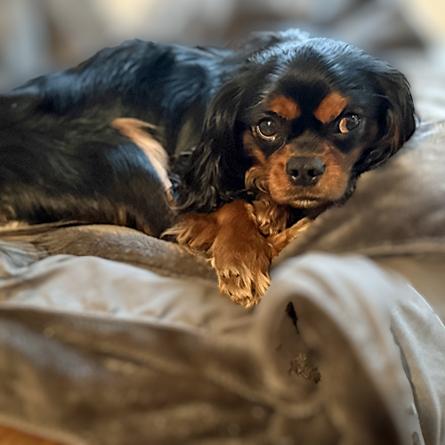 Teddy is a 13-pound Cavalier with a gorgeous black and tan coat, born November 16, 2024. He was previously in a home with children and was very sweet with them, but his barking triggered one of the children diagnosed with autism.