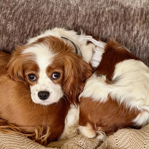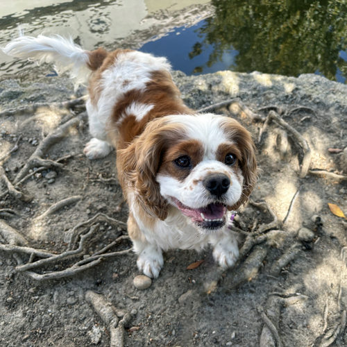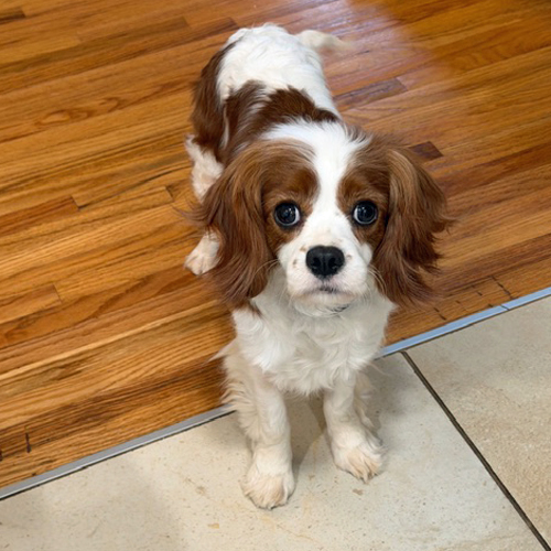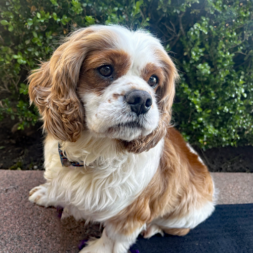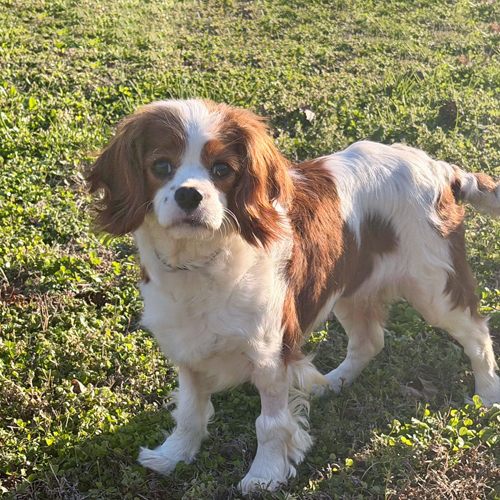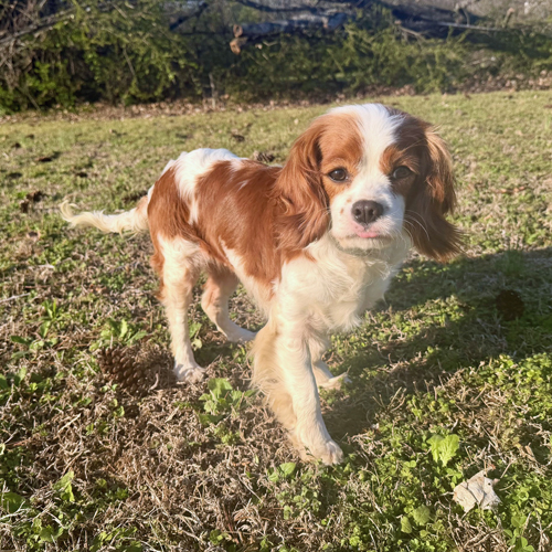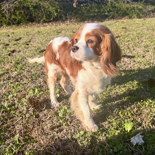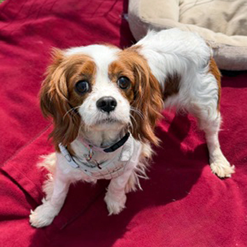 Hi! My name is Dixie, it’s nice to make your acquaintance! I am a sweet and beautiful Blenheim Cavalier King Charles Spaniel. I came to rescue from a breeder and am estimated to be around 5-years-old. I am sweet, curious and gentle. My favorite thing to do is hang out with my foster brother, I love following him around and seeing what he is up to, sometimes I even run and playfully tackle him which always makes my foster mom laugh.