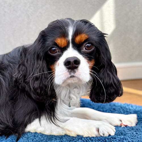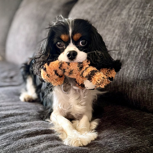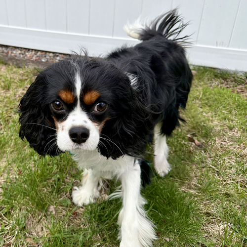 Pug, yeah, I know a silly name for a Cavalier! And I am definitely a Cavalier! I came from a scary place and even though I am safe now, there are things that still frighten me and make me back away. My foster mom and fur brother and sister are helping me learn how to be a spoiled dog.