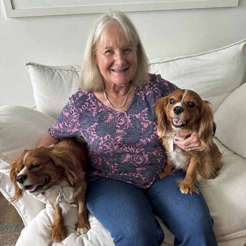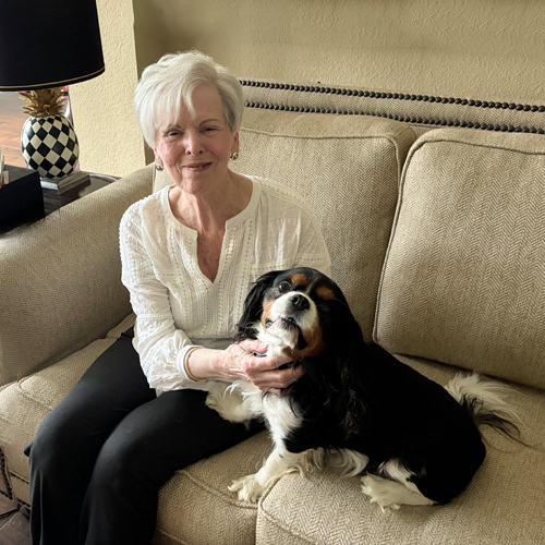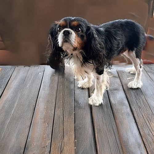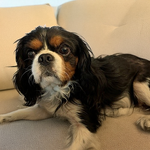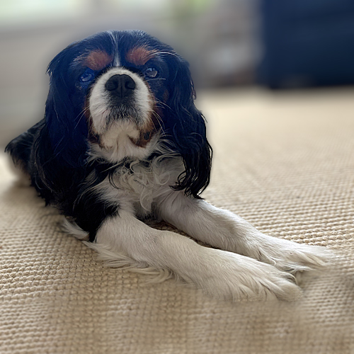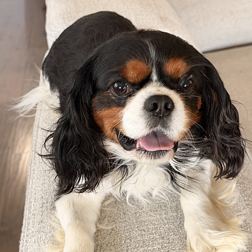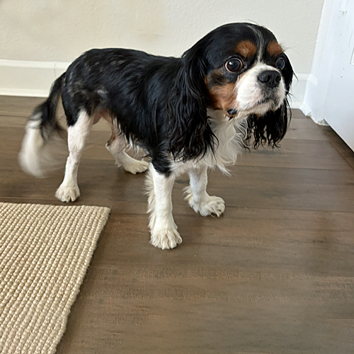 She is growing into a typical Cavalier, always wanting to keep her people in sight and snuggling into their laps in the evening. This suits her calm and gentle demeanor nicely. Like most Cavaliers, her favorite time of day is mealtime, when she eagerly barks to encourage the people to move faster!