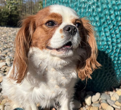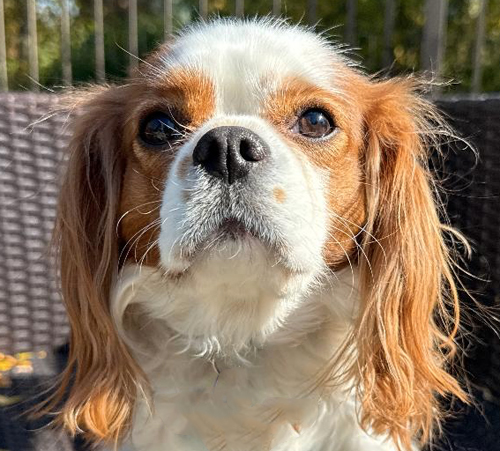 Phoebe and Pearl are a bonded pair. Phoebe is an 11-year-old Blenheim, and Pearl is a 10-year-old and black and white. Both girls were in rough shape when they came into rescue, but they are now thriving in their foster home. They have wonderful, sweet personalities. They are a relaxed and affectionate pair who just want a comfortable and loving home for the rest of their days.