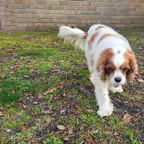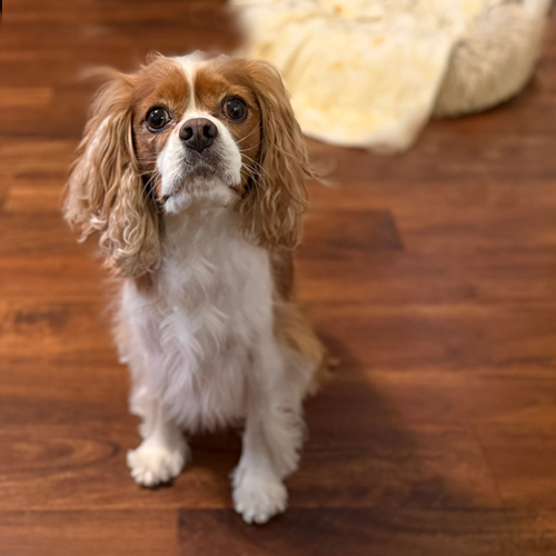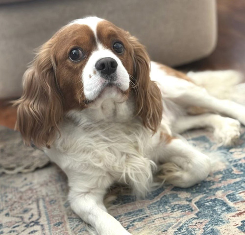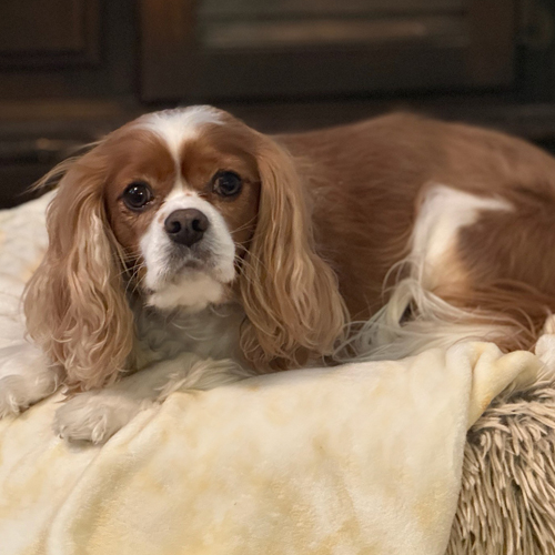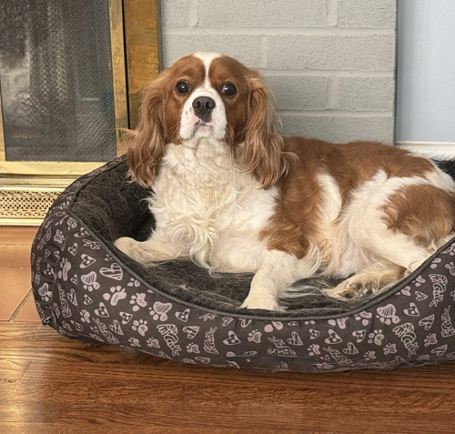 Henry is a true gentleman. He has been a complete joy in his foster home. He is respectful of the two household female Cavaliers at all times. Henry loves to play fetch with balls and stuffies, and a game of chase is great fun. He is good about sharing and lets the girls win. Afterwards he likes to share a dog bed or the couch for a good snuggle and nap. He loves to eat his food, but never tries to steal from another’s bowl. He is respectful to a cat, although curious.